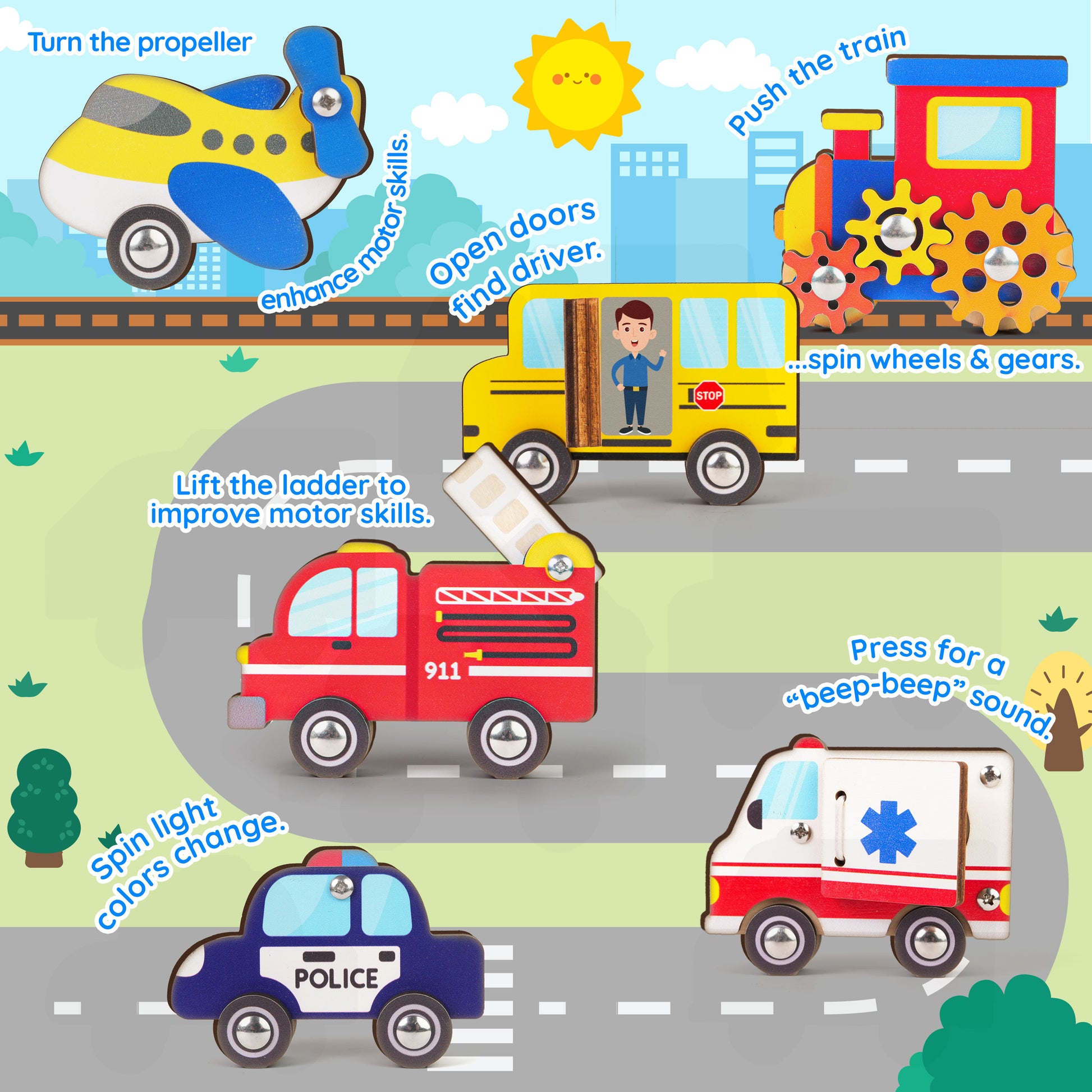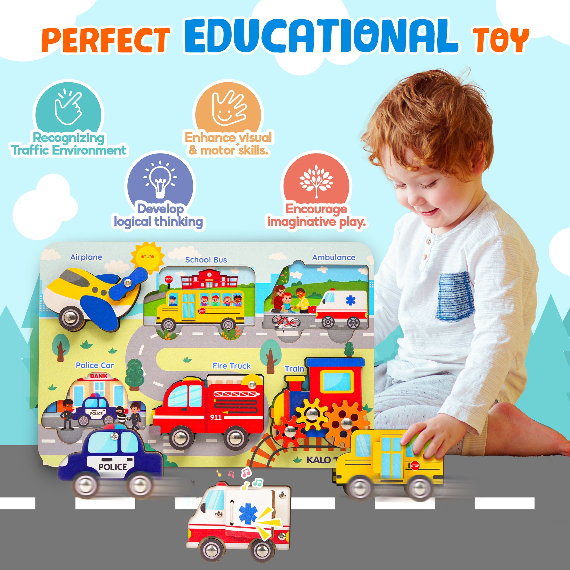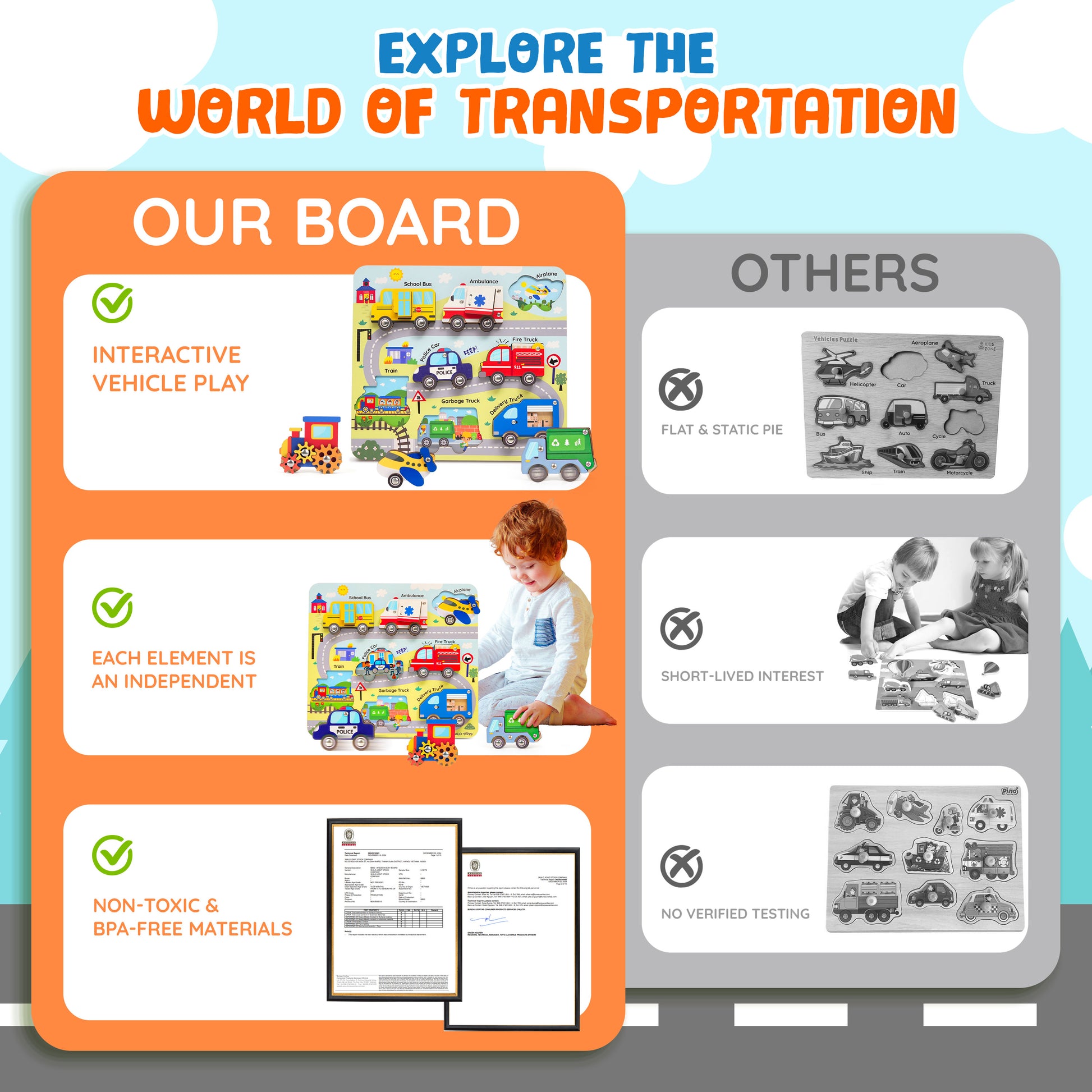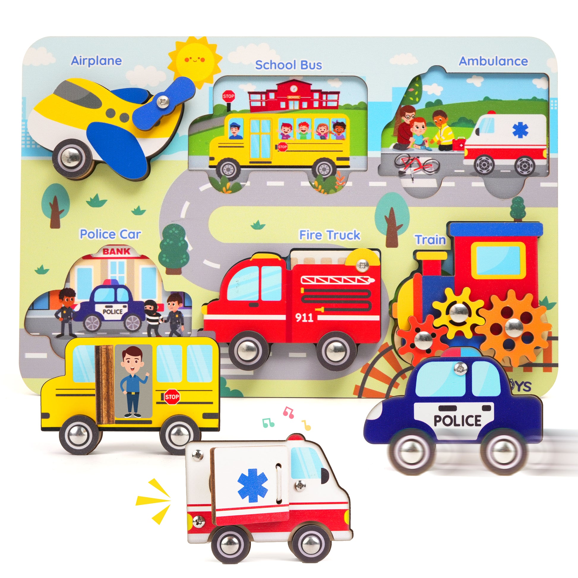Let your little driver explore a world of motion, color, and discovery with thisย interactive wooden vehicle puzzle. Each car, plane, and train comes to life with moving parts, sounds, and textures โ helping toddlers learn through hands-on play the Montessori way.