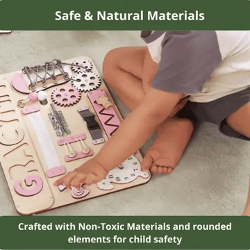 Yes, safety is our top priority. The Personalized Busy Board is crafted from child-friendly materials, featuring rounded edges and smooth surfaces. It's designed to be a safe and enriching addition to your toddler's playtime.