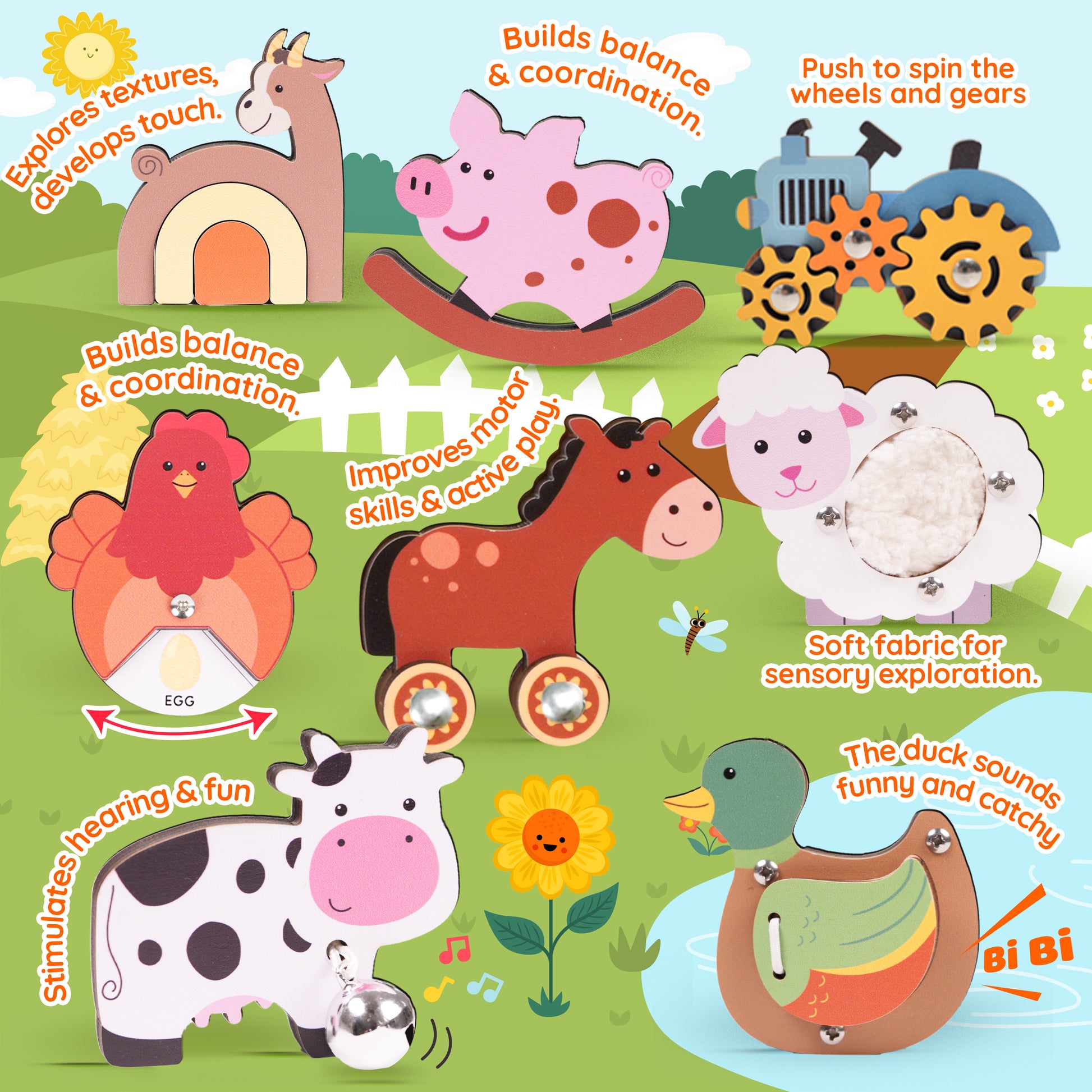 Each animal introduces a unique way to play — from sounds and textures to rolling, rocking, and spinning motions that stimulate all five senses. -